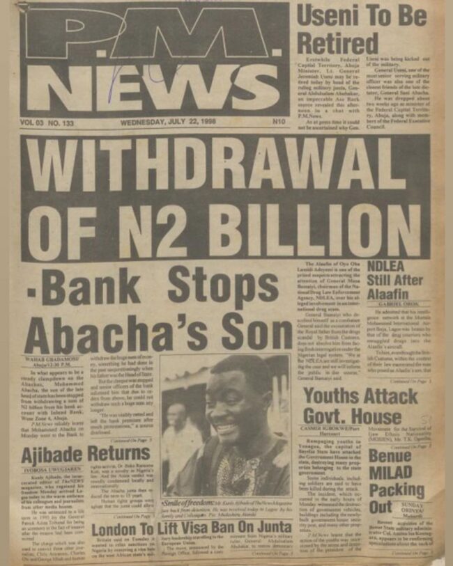 Twenty-six years ago, the story “Bank Prevents Abacha’s Son from Withdrawing 2 Billion Naira in Cash” was the headline of P.M. News. This is dated Wednesday, July 22, 1998.