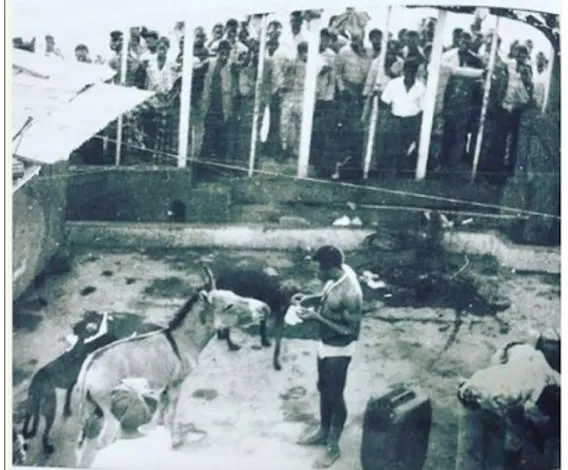 People are seen in the photograph watching the renowned Afrobeat pioneer, Fela Anikulapo Kuti, feed his donkey, Yakubu, which he named after the then-President of Nigeria, General Yakubu Gowon, at his Kalakuta Republic residence in Lagos.